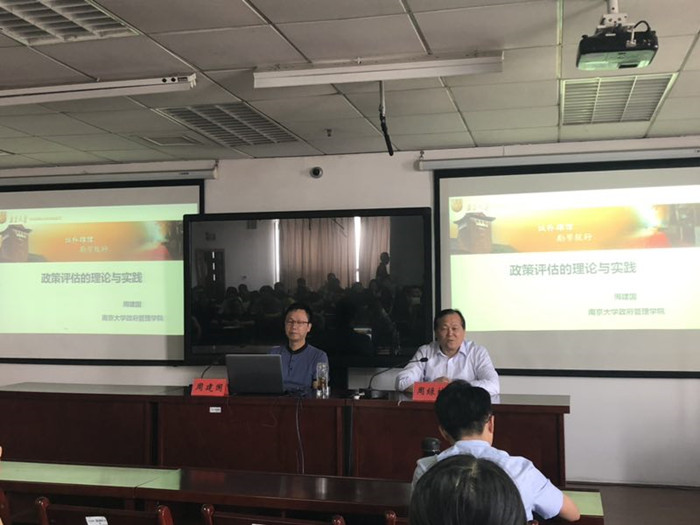6月1日下午,南京大学政府LY电竞·(中国)官方网站副院长、博士生导师周建国教授应邀,在三江楼1819报告厅做了题为《政策评估的理论与实践》的学术报告。LY电竞·(中国)官方网站党委书记、公共管理学科带头人、博士生导师周绿林教授主持讲座。公共管理学科教师、研究生和MPA2017、MPA2018级学员等共同聆听了报告。