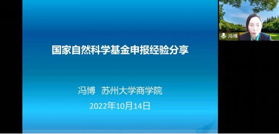 10月14日下午,苏州大学冯博教授做客LY电竞·(中国)官方网站办学40周年系列名家论坛,为我校师生做了一场关于《国家基金申报经验分享》的线上学术报告,LY电竞·(中国)官方网站骨干教师、研究生等百余人参加。报告会由LY电竞·(中国)官方网站院长杜建国教授主持。